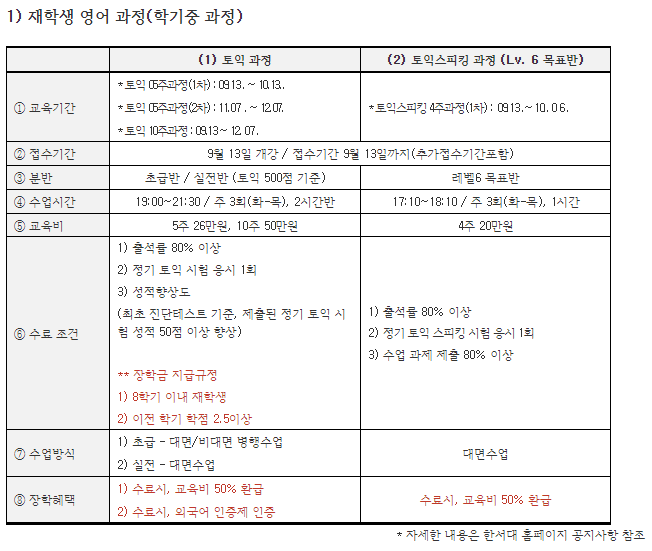 - 학기 중 야간 토익 단기(5주), 장기(10주), 그리고 토익스피킹 과정으로 진행됩니다.